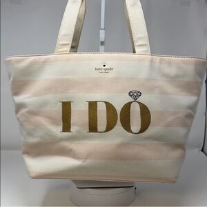 Kate Spade New York "I Do, I Did" tote bag, part of the "Wedding Belles" collection. This bridal-themed tote bag is made of canvas with a pink and white stripe pattern and gold-tone hardware. The words "I DO" are printed on one side with a diamond graphic, and the other side features the words "I DID", making it a popular accessory for a variety of wedding-related occasions such as bridal showers, engagement parties, or honeymoons. It even has a custom couple themed storybook lining!