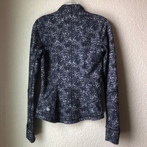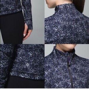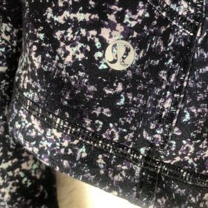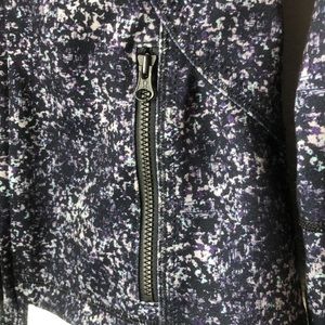 Lululemon forme jacket II. The jacket has thumbholes and 2 zipper pockets. It also has the fold over hand warmers (cuffins). The color is called Rocky Road Sand Dune Toothpaste (black with purple and a little blue & grey).