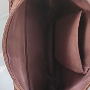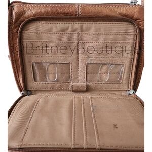 Front flap revels larger pockets for cash, or phone and 3 pockets for smaller docume ts or passport.