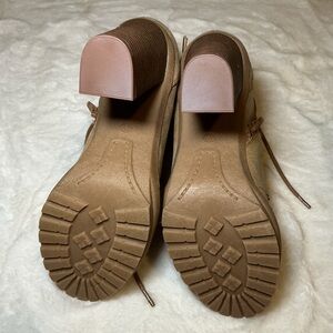 Stylish tan lace-up ankle boots with a chunky heel and gold accents. Perfect for adding a chic touch to any outfit.
