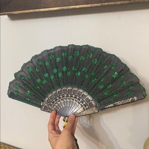 This elegant hand fan features a striking green and black design, perfect for adding a touch of sophistication to any outfit. Ideal for special occasions or as a unique accessory.