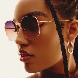The NEW Quay Australia Jezabell Round Sunglasses are unisex and feature a stylish gold oversized frame. The lenses are gradient and polarized, offering both style and protection. These designer sunglasses are lightweight and adjustable, making them comfortable to wear for any occasion. Made with polycarbonate lens material and a plastic and metal frame, these sunglasses are durable and high quality. The black smoke lenses add a sleek touch to the overall design, making them a must-have accessory for any fashion-forward individual.