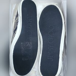 Stylish slip-on flats. Features a woven blue and tan pattern. Comfortable and chic design.