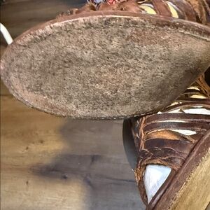 Pre-owned brown heeled boots with intricate woven design. Crafted laser-cut leather and detailed with braided accents. Leather upper, leather lining, leather sole Made in Mexico 3 ½” Heel Height 4 ¾” Shaft Height 10 ½” Shaft Circumference, zipper back closure