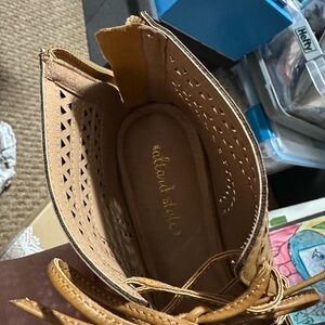 Stylish Alter’d State whiskey lace-up heels. Features detailed cut-out pattern. Perfect for any occasion.