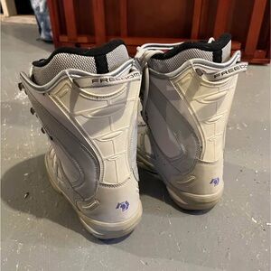 Stylish gray and cream snowboard boots. Perfect for winter sports.