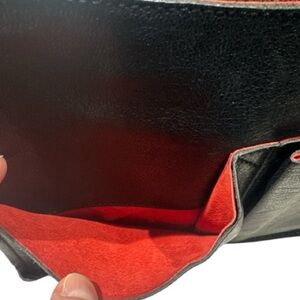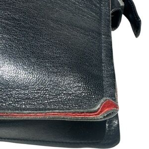 Beautiful black leather bag by Bally with red suede interior, two open slip pockets on the front with no interior pockets. Missing center removable zip pouch. Very clean interior. Antique gold tone hardware. Strap adjustable to two different lengths.