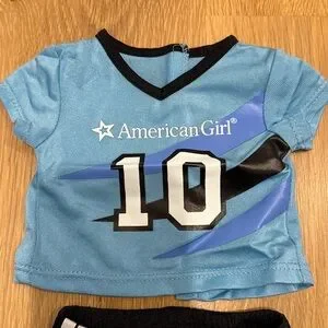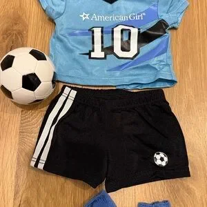 American Girl soccer doll outfit. Blue jersey with number 10. Black shorts with white stripes. Includes blue socks, black shoes, white shin guards, and a soccer ball.