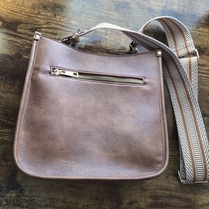 Stylish brown crossbody bag with a unique patterned strap. Perfect for everyday use.
