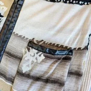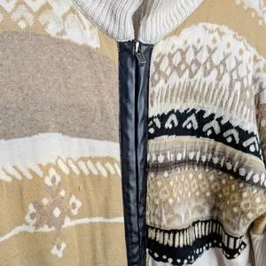 Designer Chacok “Meribel” zip cardigan sweater, designed and made in France. This unique piece features a beautiful jacquard knit pattern in neutral earth tones, making it both versatile and visually striking.