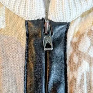 The cardigan is crafted from a luxurious wool blend and finished with leather-trimmed zipper and pocket details, adding a refined, high-end touch. Features a stand collar, front zip closure, and front pockets.