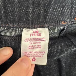 No Boundaries Faux Jeggings Dark Wash Leggings in Juniors Size Large / 11 - 13. Cropped leggings in very good used condition with no flaws or stains other than some minor wash wear. Please see close-up pictures for condition details. Cotton, polyester, and spandex blend. Manufacturer calls this color: Dark Wash. Made to look like dark wash jean leggings.