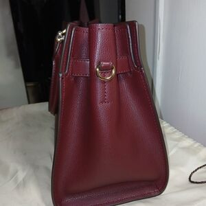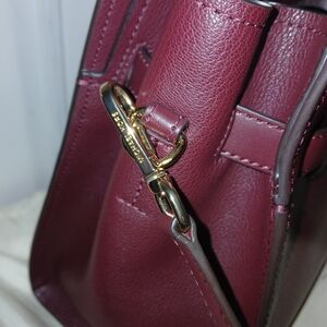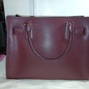 Gorgeous, bold oxblood color, large, leather Satchel. Classy gold hardware, adorns this sophisticated shoulder bag which comes with detachable and adjustable, long crossbody strap. Wear it how you want to!