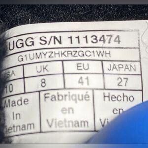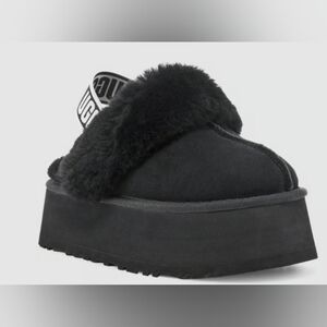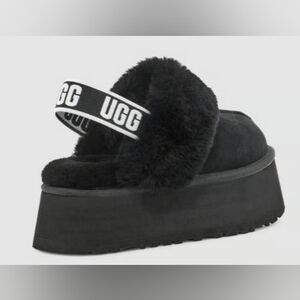 Stylish black platform slides. Fluffy upper with UGG branding. Comfortable and trendy.