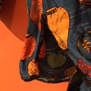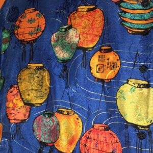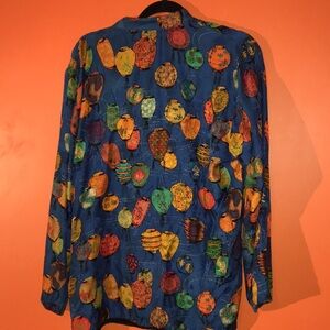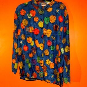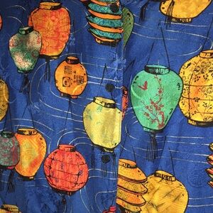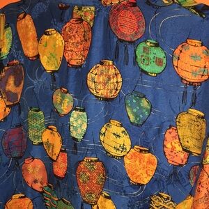 Vibrant long sleeve shirt / blouse / tunic top with a playful Japanese lantern pattern. Features a mix of bright colors on a blue background.