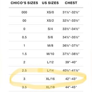 Size 3 = Woman’s large 12/14/16 plus size - see Chico’s size chart in photos and measurements
