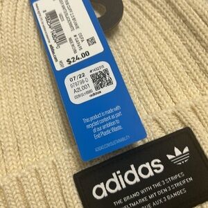 Adidas Rib Cuff 2.0 cream beanie with a ribbed design. Features a logo patch on the front. New with Tags. One size, but smaller beanie, very stretchy.