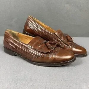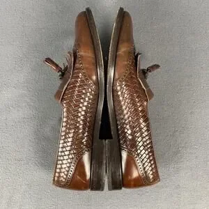 Style: Mens tassel loafers with woven leather sides, brogue detailing at the toe, and kiltie fringe across the vamp.