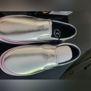 Sleek silver loafers with a modern design. Easy slip-on style. Ideal for casual outings.