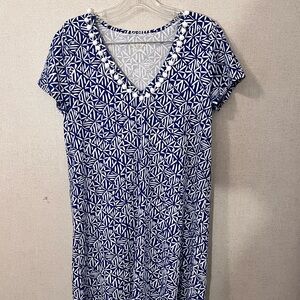 Plush pompom trim details the wide V-neck of a casual-chic knit shift elevated with an allover geometric print. Style Name: Lilly Pulitzer Etta Print Shift Dress. Style Number: 6269530.
