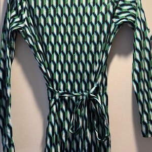 Elegant wrap dress by Diane Von Furstenberg. Features a striking teal and black geometric pattern.