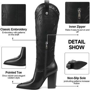 Women 2 Black Embroidered Pointed Toe Knee High Western Chunky Heels Boots