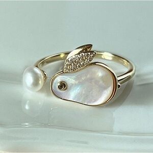 Elegant gold ring with a pearl and apple design. Features a white and gold apple with a sparkling accent.
