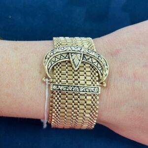 This vintage belt bracelet is an extraordinary statement piece crafted in solid 14k yellow gold with black enamel detailing. Designed in the form of a stylized buckle, the bracelet showcases remarkable craftsmanship and bold presence, measuring 26mm wide and weighing a substantial 66.8 grams.