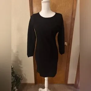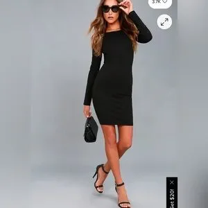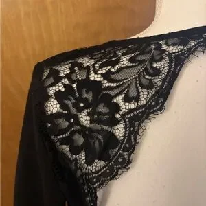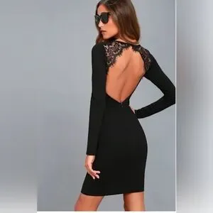 Chic black dress with lace detailing. Features a bold backless design. Perfect for evening events. Pit to pit 18 length 34.