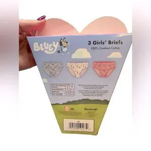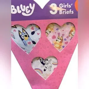 Childrens Character Valentine's Day Underwear Set, Bluey. Adorable girls' briefs featuring playful designs. Soft and comfortable for everyday wear. Includes vibrant multicolor patterns. Size:4T. Set includes 3 pair of combed cotton girls’ briefs style underwear with Bluey designs. Condition: NWT.