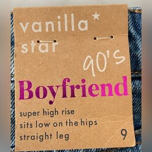NWT Vanilla Star Women's Juniors Distressed 90's Boyfriend Jeans. Size 9. They are a super high-rise, straight-leg style of denim with a distressed look. In new tag condition. See photos for measurement and condition details. Model photos are forfeit and view purposes only. Color and style may vary.