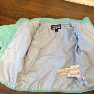 Aqua quilted jacket by Patagonia. Features a zip-up front and warm design. Light green / teal color. Girls 3T. Worn by one girl, smoke and pet free home.