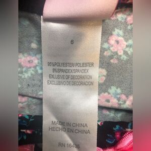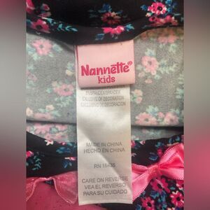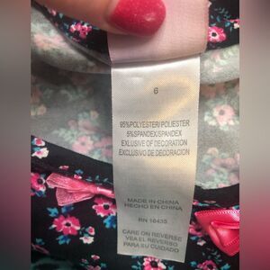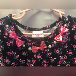 Nannette flowy floral long sleeve top. Size: 6 (two available). Colors: black, pink, blue. Features: pink bows and pearl accents at neckline and a flowy bottom hem with chiffon and flowy accents with chiffon on cuffs of sleeves. Fabric: 95% polyester, 5% spandex. RN 16435. Condition: pre-owned, excellent. No rips, stains, tears, or fading. Cross-posted.