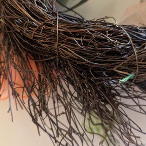 NWT, lovely floral wreath featuring peach, pink and white colored silk roses and peonies on a wood twig base, by Michael's Ashland. This rustic farm house-style decor item measures approx 16" diameter on the front, the twig base is 12" in diameter, and is new with $50 tags. A pretty gift, and makes a perfect faux floral accent piece for a seasonal home rejuvenation!