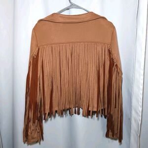 Chartou Faux Suede Camel Color Jacket in size M. The cropped length with fringe trimming adds a trendy touch, soft faux suede, no closure, lightweight, long sleeve. Armpit to Armpit 22 in length 20 in sleeves 25 in. NWT