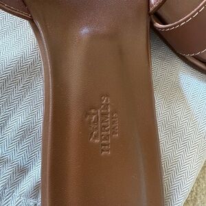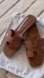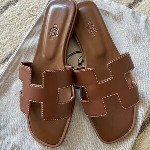Sleek tan leather slides with iconic cut-out design. Ideal for any occasion (NOT original but premium workmanship). Size 38 runs more like 7.5-8. Come with dust bag. I am a true 7 and have narrow feet so these are a tad loose on me. I really like the workmanship. 🪴price is firm!!🪴
