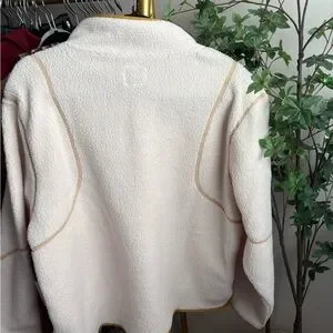 Cozy cream jacket with tan accents. Features a stylish turtleneck design. Ideal for warmth and comfort.