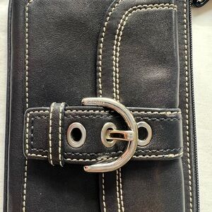 Chic black leather wristlet by Coach. Features contrast stitching and buckle accent. Ideal for versatile styling. Good shape except zipper has just the little circle to grab, the other part fell off, and some makeup inside (see picture) I have not tried to clean it. Zipper works well. Front pocket is functioning. Just under 8” long, about 4.5” high.