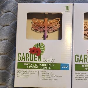Set of 3 brand new LED metal dragonfly string lights. Perfect for garden decor. Features pink and orange dragonflies.