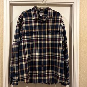 Classic Carhartt shirt with a bold plaid pattern. Features navy, red, and cream colors. Perfect for casual wear.