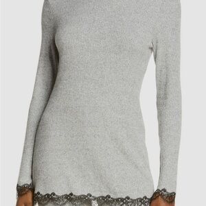 Elegant gray knit pajama top with black lace accents. Ideal for lounging or sleeping.