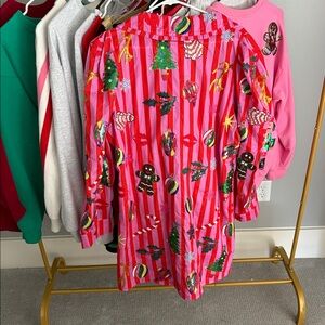 Vibrant pink striped shirt with festive holiday designs. Features Christmas trees, ornaments, and gingerbread men.
