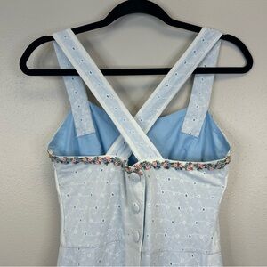 Vintage Handmade Corset Back Floral Maxi Dress in a light blue and white color. Blue lining. Elegant white eyelet maxi dress with ruffle hem. Features a unique strap design. No visible signs of wear or stains. Button up back. Embroidered flower trim across top. No fabric or brand tags. I would guess the fabric is 100% cotton.