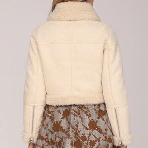 This shearling-trimmed aviator jacket is a bold blend of cozy warmth and elevated style. Crafted in a creamy, textured fabric embroidered with delicate botanical motifs, this cropped silhouette brings soft structure to cold-weather dressing.