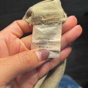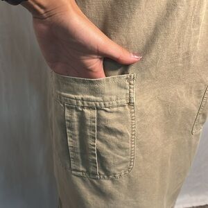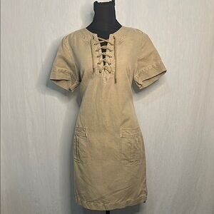 This tan short-sleeved dress is perfect for effortless style. Features a lace-up neckline, cuffed sleeves, and two front patch pockets. Great for casual wear, errands, or weekend brunch. Gently worn and preloved, in excellent condition.