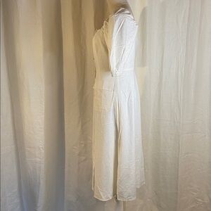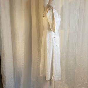 white linen blend puff-sleeve button-front midi dress with two front pockets, body lined, sleeves unlined