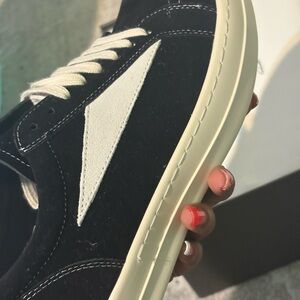 Bold black boots with cream accents. Unique platform design. Ideal for contemporary style.