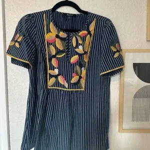 Navy blouse with white stripes. Features vibrant floral embroidery. Short sleeves with embroidered accents. Perfect for casual or office wear.