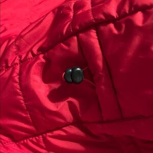 Lands End Stylish and warm mid length down coat. Has detachable hood. Snaps and zips. Hidden zip pockets on side of coat. Vibrant red color.