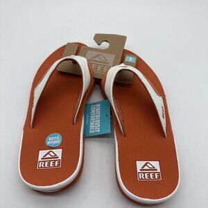 The Reef Fanning Pregame flip-flops in size 7 are a vibrant orange sandal with a slip-on closure, perfect for casual occasions during the summer and spring seasons. The flip-flop features a solid pattern with a logo accent, making it a stylish choice for men. The faux leather upper material and comfortable shoe width M provide durability and comfort for all-day wear. Additionally, this unique model from Reef also serves as a bottle opener, adding a fun and practical element to the design. Perfect for those who love the beach and want a reliable and fashionable sandal.